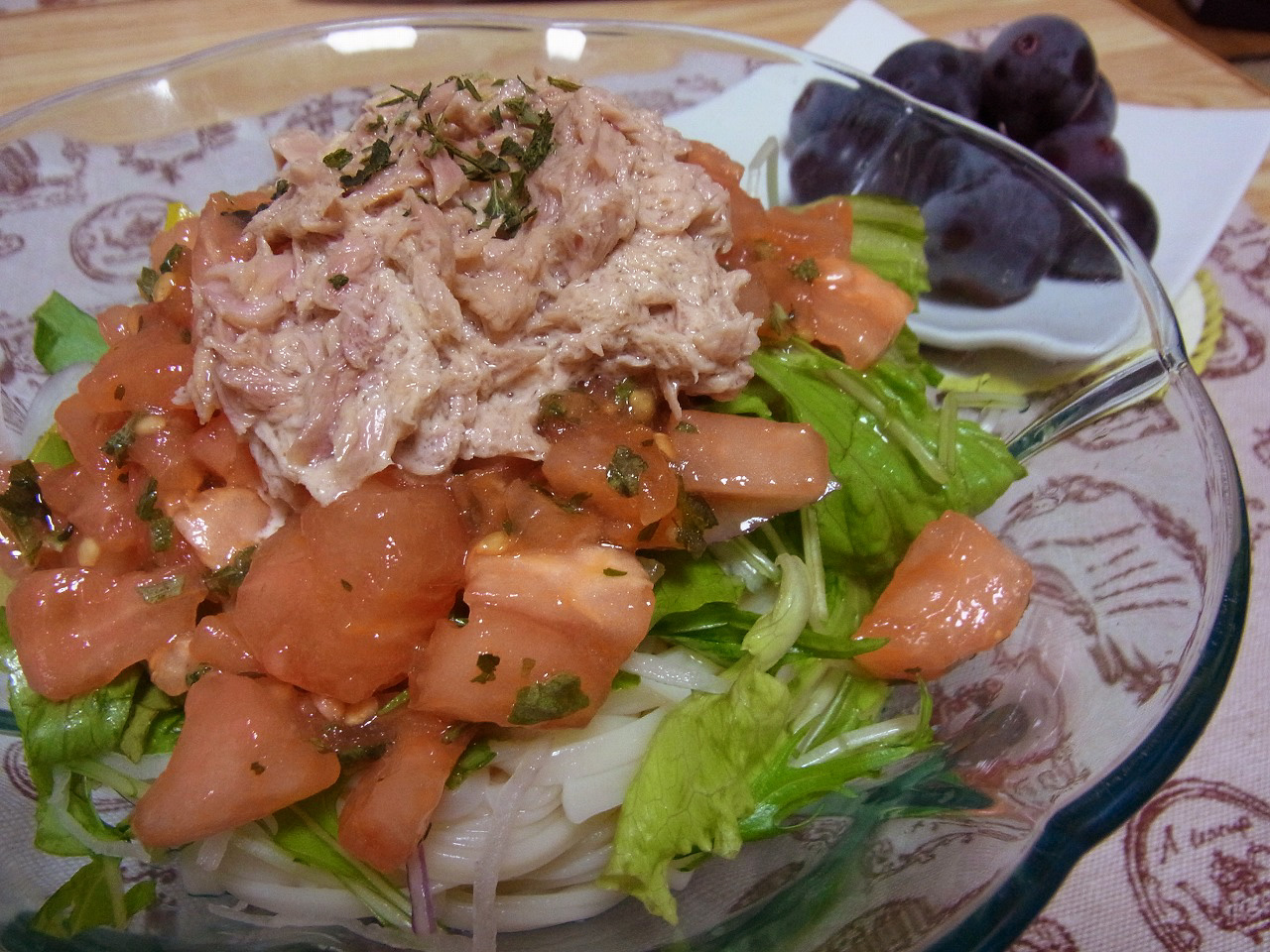 今回はスイートバジル、オリーブ油、めんつゆなどと和えたトマトと、ツナマヨを乗っけてサラダパスタに。