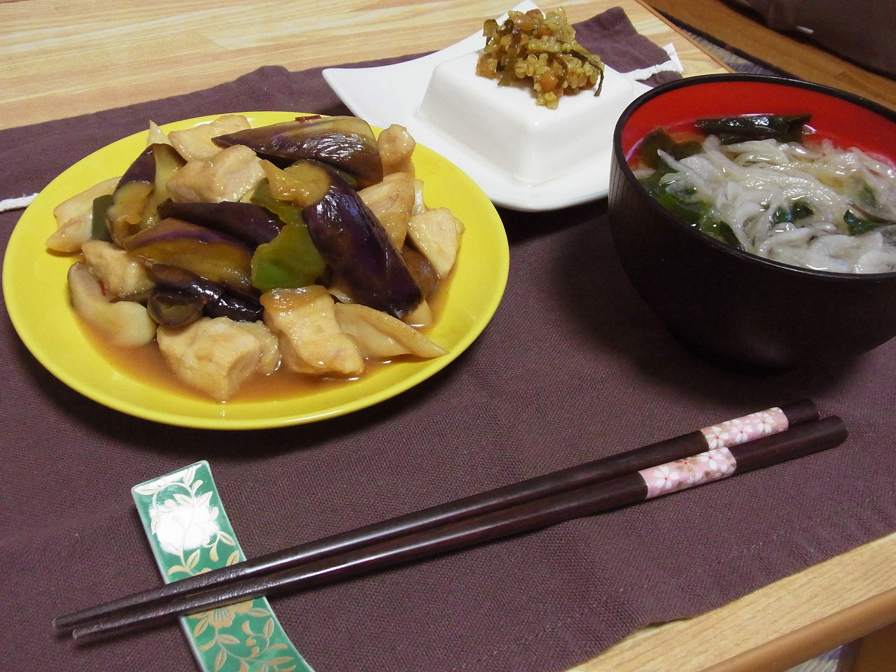 <なすと鶏胸肉の甘酢炒め、島原納豆味噌の冷奴>