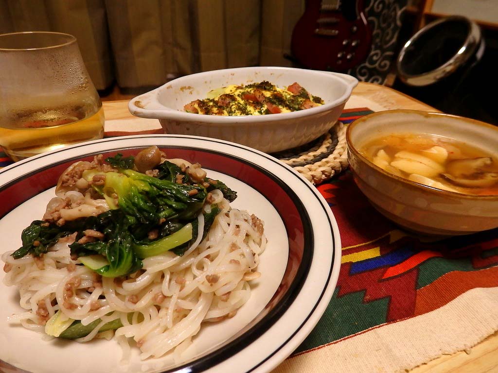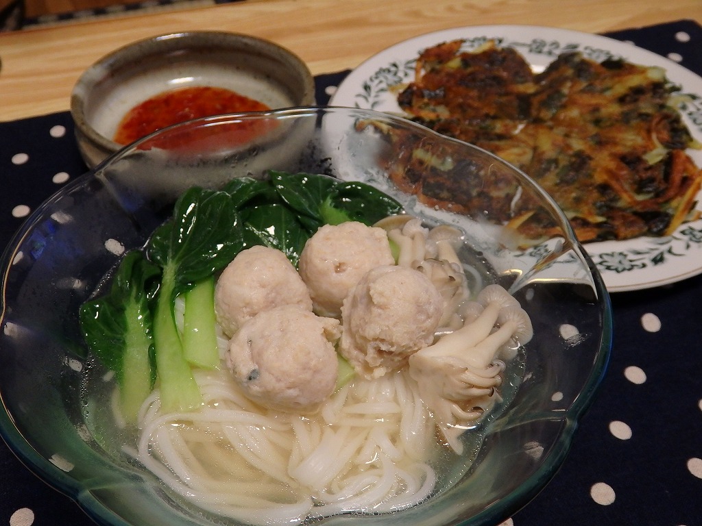 <ちょっと和風な汁ビーフン、ジャガイモとにらのチヂミ風>
