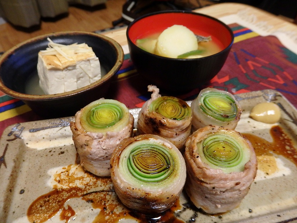 <リーキの豚バラ巻き、いりこだし豆腐、ジャガイモといんげん、いりこの味噌汁>