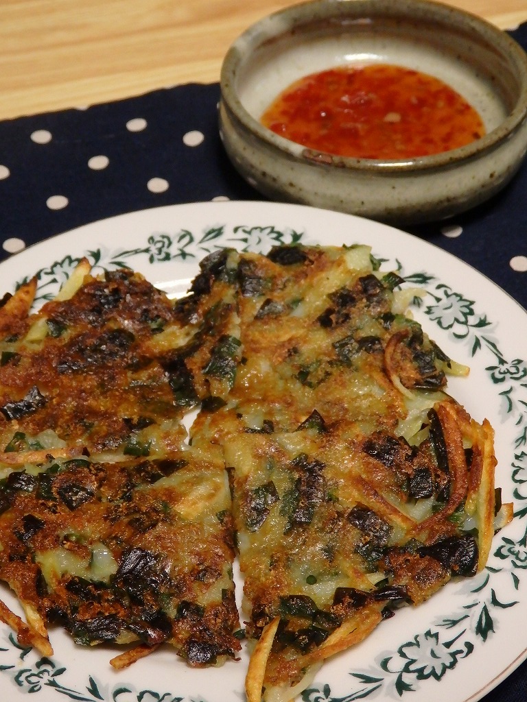 チヂミ風の何かは、さっくり感では小麦粉に譲りますが、もっちり感がええ感じ。