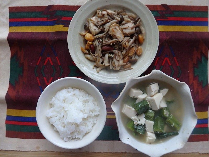<スモーキーきのこ炒め、おくらと豆腐の味噌汁>