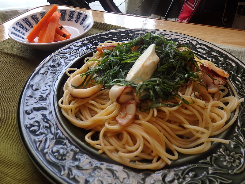 <剣先イカと大葉のバター醤油スパゲティ、人参のピクルス>