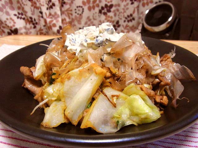 たっぷりキャベツとねぎ、鶏肉を入れたお好み焼き。
