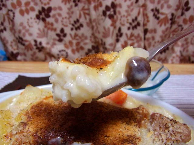 ご飯の上にシチューをかけて、チーズ乗っけて、パン粉とブラックペッパーをパラパラ。
