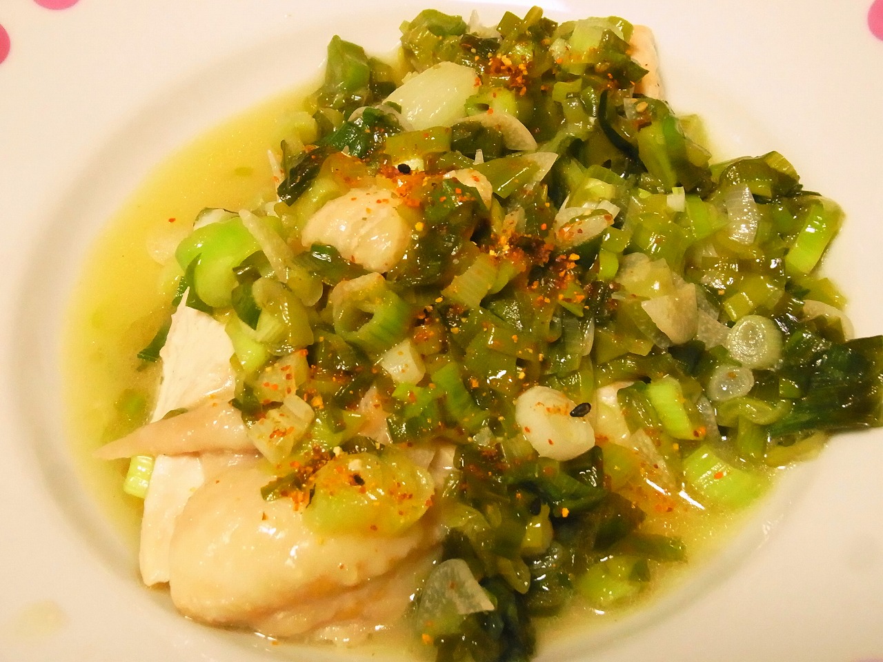 <鶏胸肉のねぎまみれ。柚子果汁と柚子七味を利かせて爽やかに仕上げました>