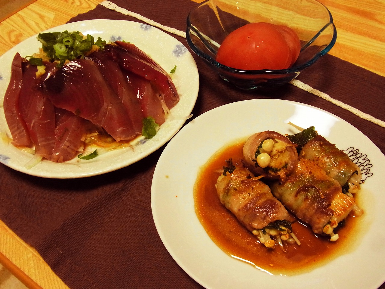 <オニオンスライスたっぷりのかつお刺身、えのきの豚バラ巻き、冷やしトマト>