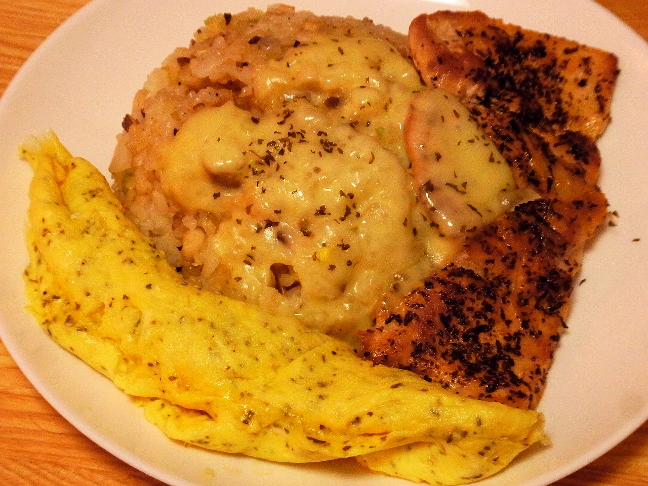 <チキンソテー、バターライス、オムレツ。パセリとバジルたっぷり>