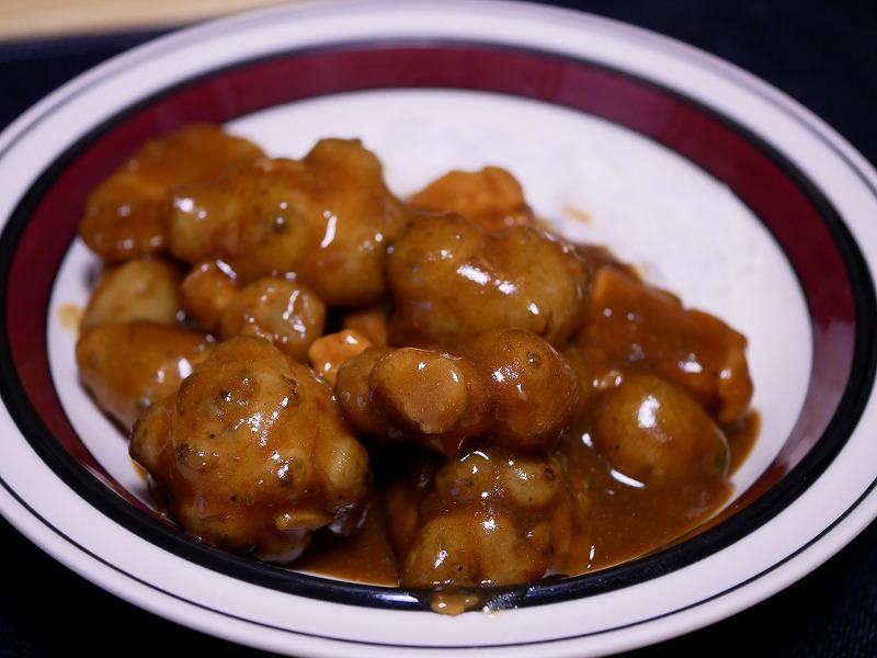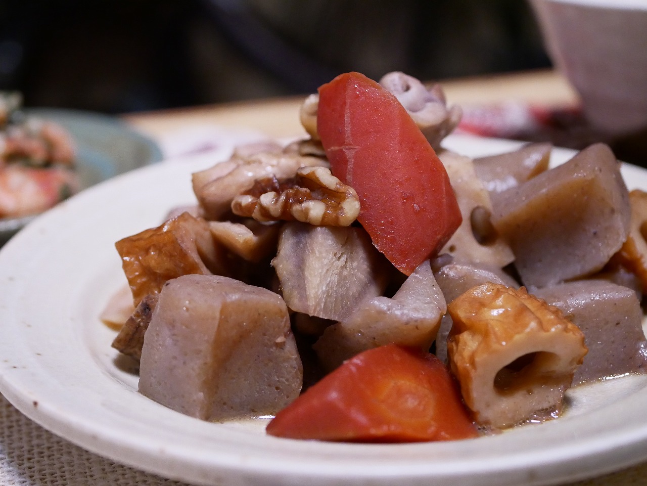 アクセントに胡桃を加えて、脂で炒めてから醤油、酒、みりんで炒め煮にしたもの。