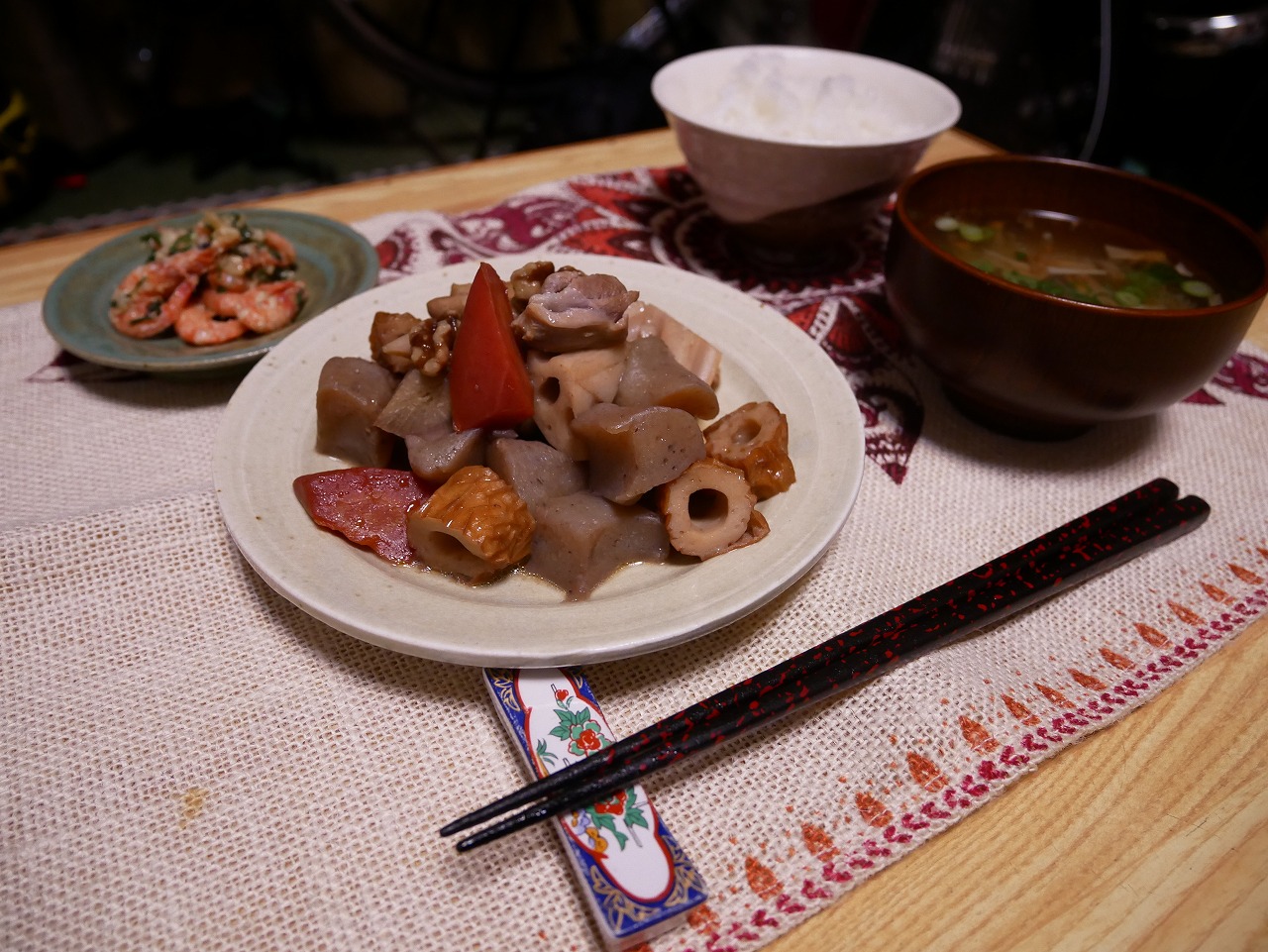 煎り鶏(筑前煮?)は鶏肉と、ごぼう、蓮根、金時人参、ちくわにこんにゃく、