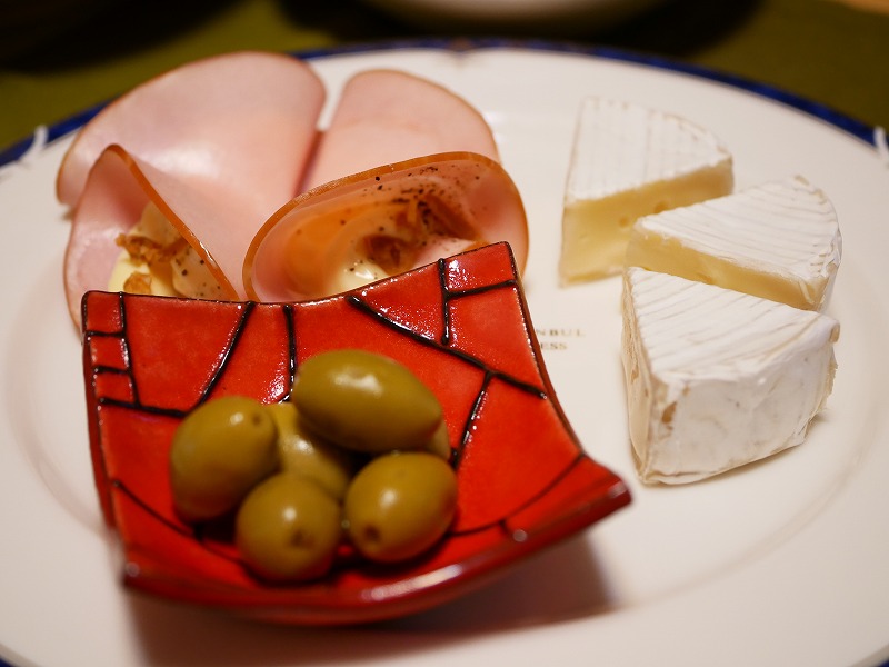 <前菜:ハムのマヨネーズ詰め、オリーブ塩漬けとカマンベールチーズ>
