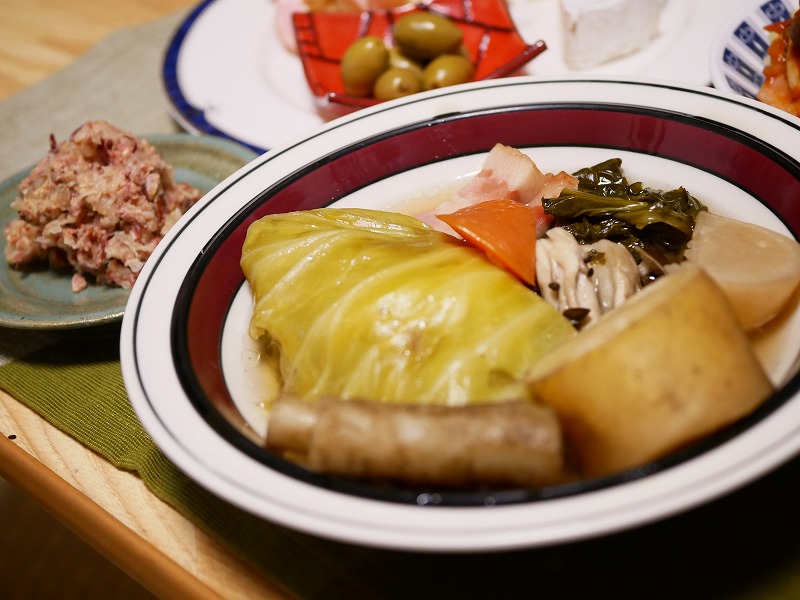<根菜たっぷりポトフ、ザワクラとコンビーフのマスタード和え>