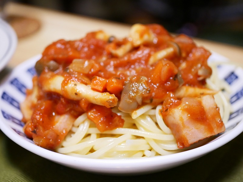 ベーコン、人参、しめじ、玉ねぎ、にんにくを炒めたものにカットトマトを加え、