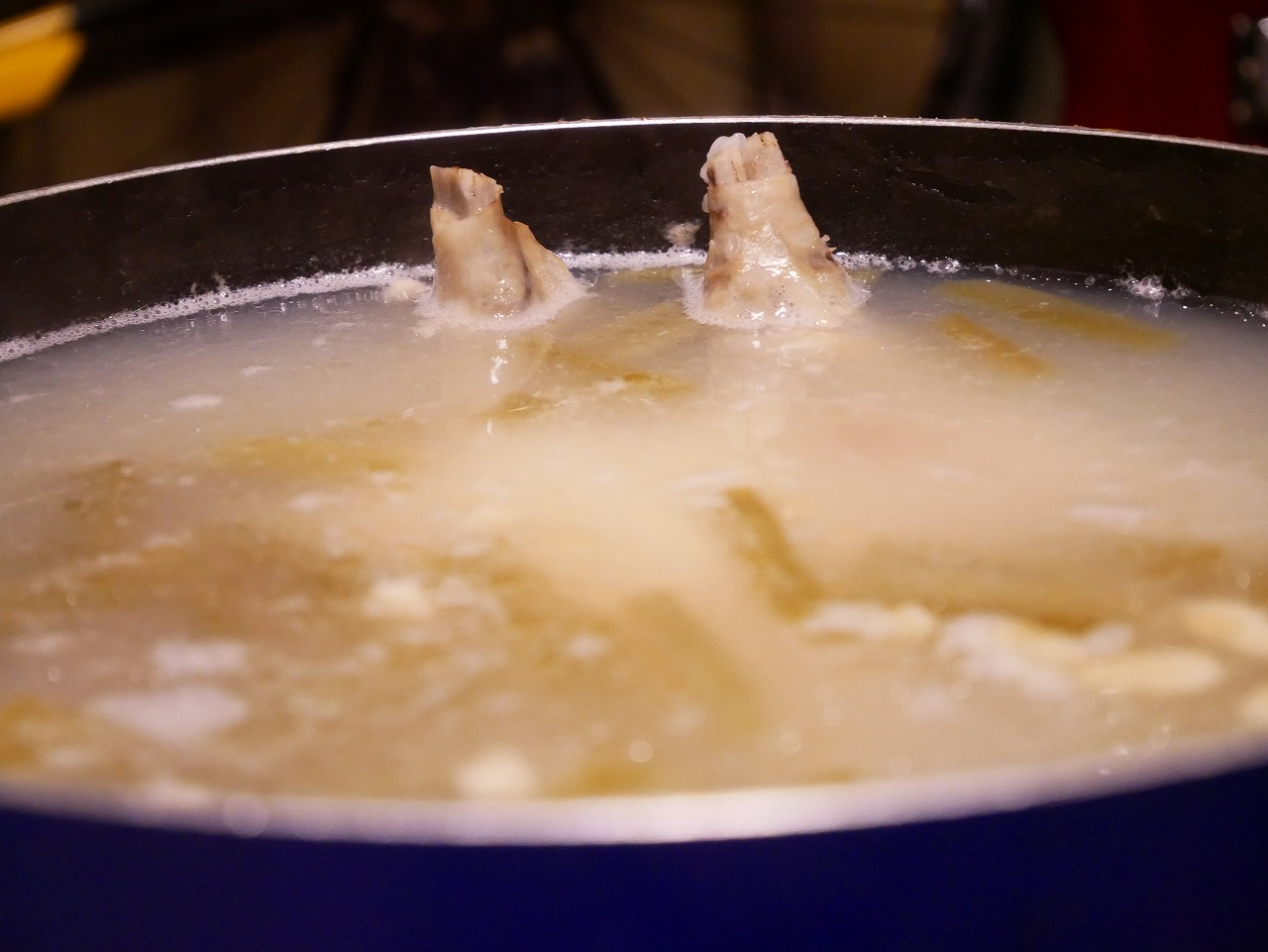 臭い消しのためのほんの少しの酒、塩と共に一日半煮込みました。
