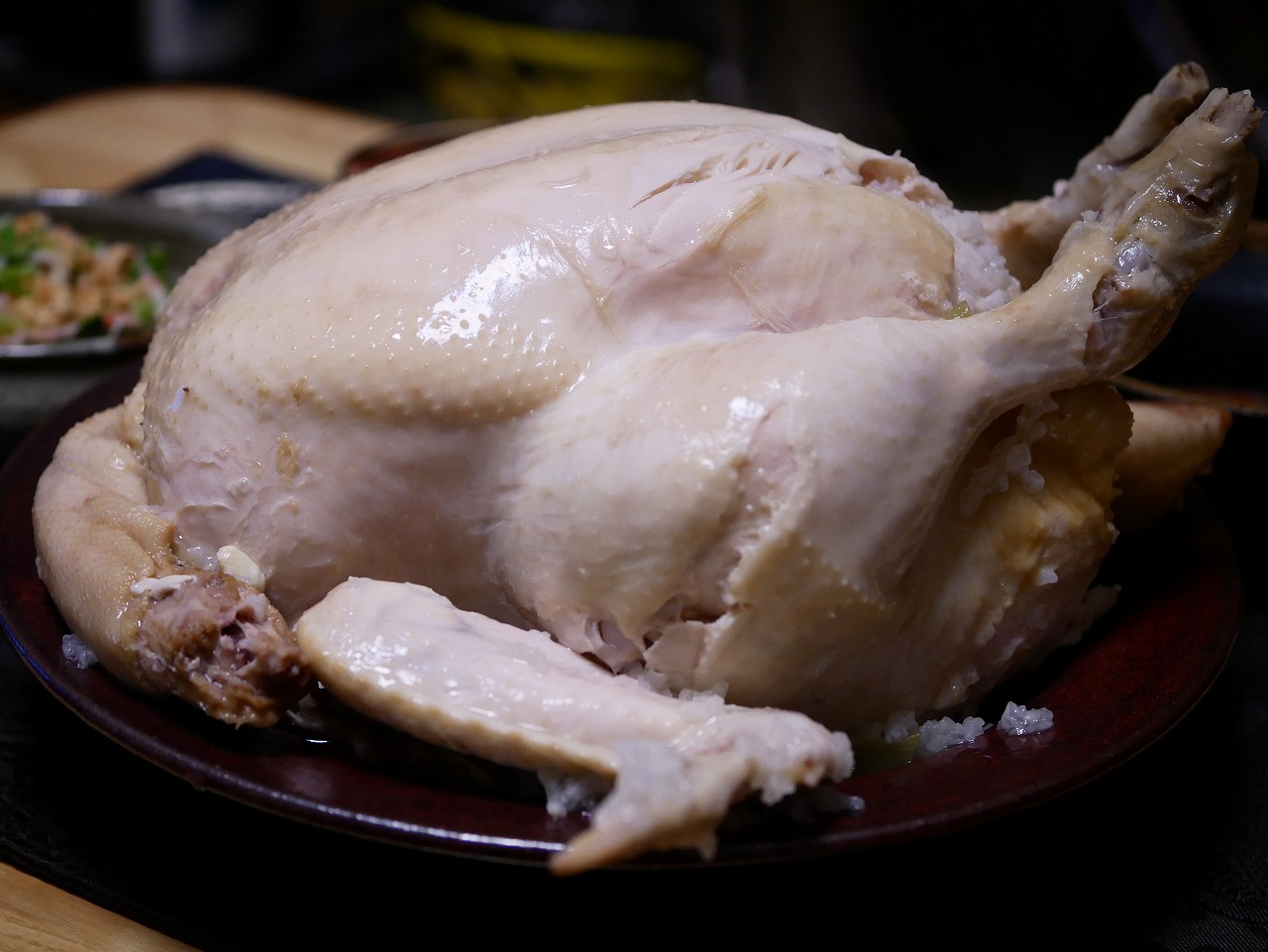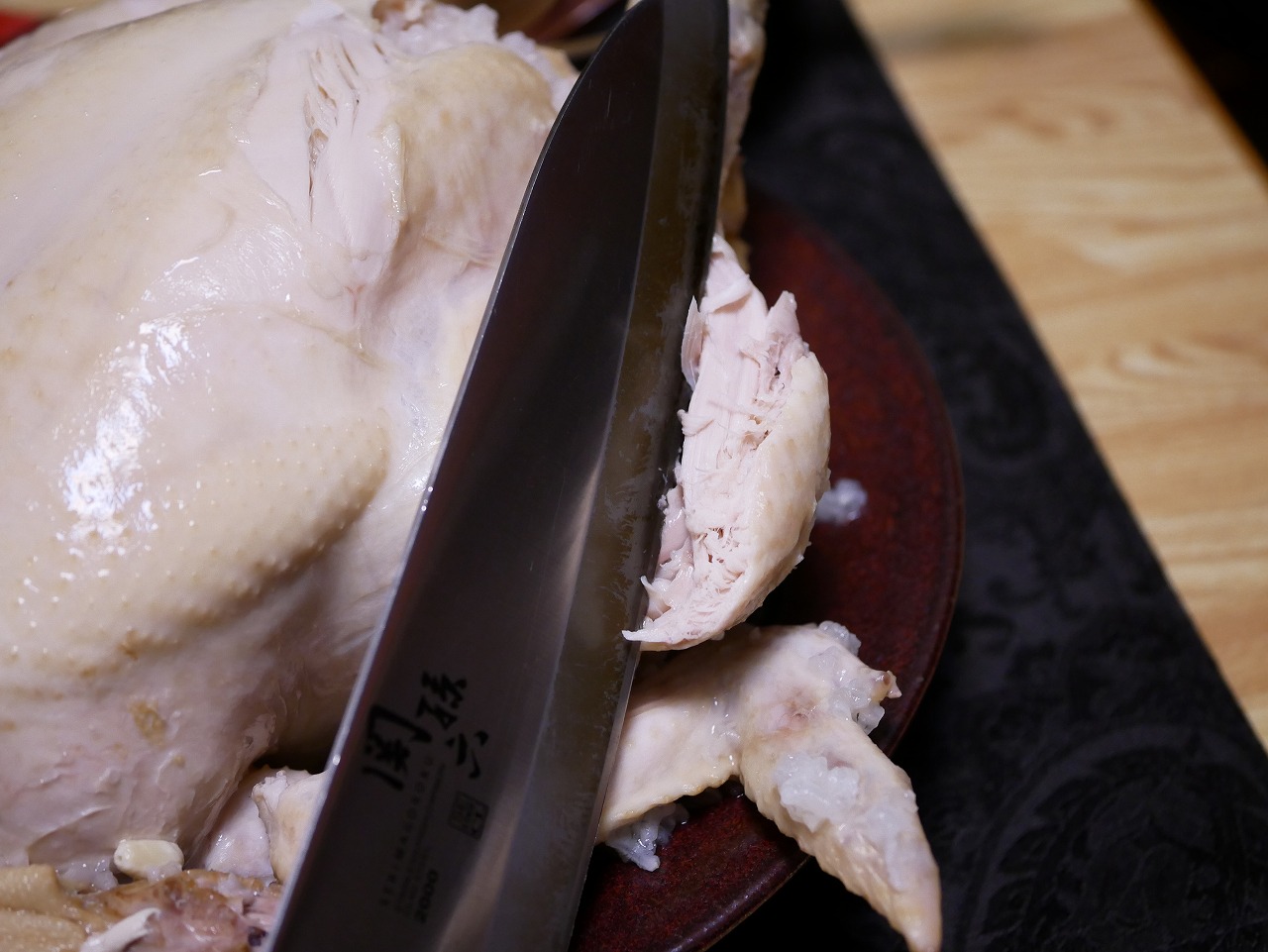 いやー、いっぺん丸鶏をこうして、ナイフで削ぎ切りしながら