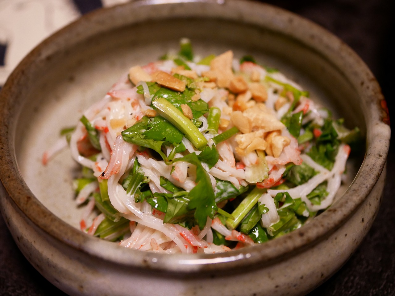 パクチーを刻んだものとカニカマをほぐしたものをマヨネーズ、黒胡椒で和え、