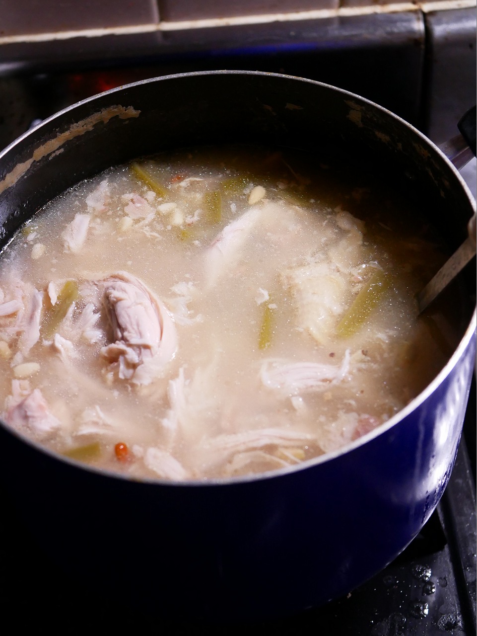 たっぷり丸鶏の出汁とコラーゲンが溶け出し、旨みの爆弾(!)のようなスープですが、