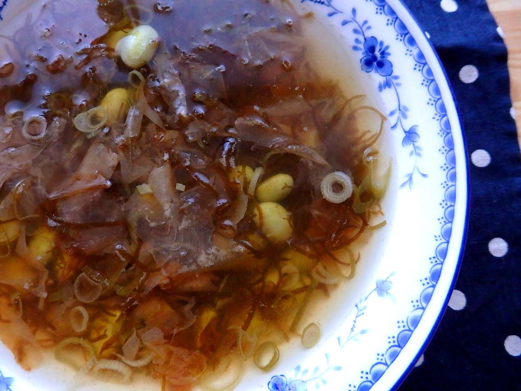 出汁にもずく酢、枝豆(冷凍食品のむき枝豆でOk)、かつお節を加えてさっと火を入れ、