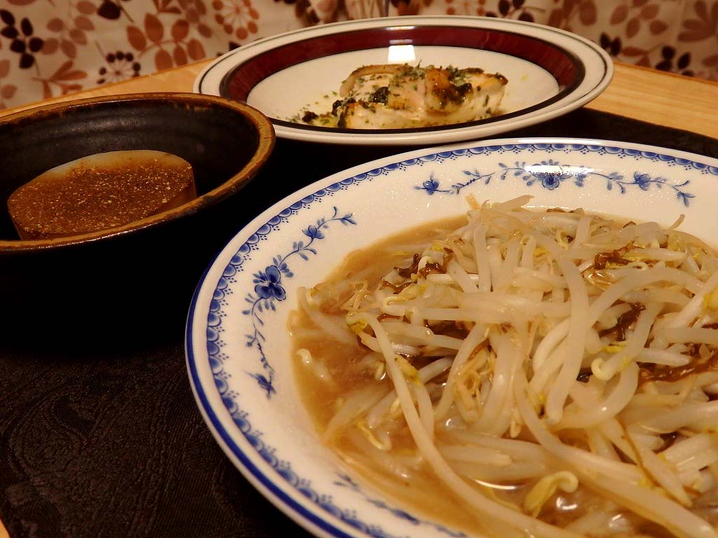 <もずく酢ともやしの炒め、鶏ソテーのバジルソース、小兵衛さん大根>
