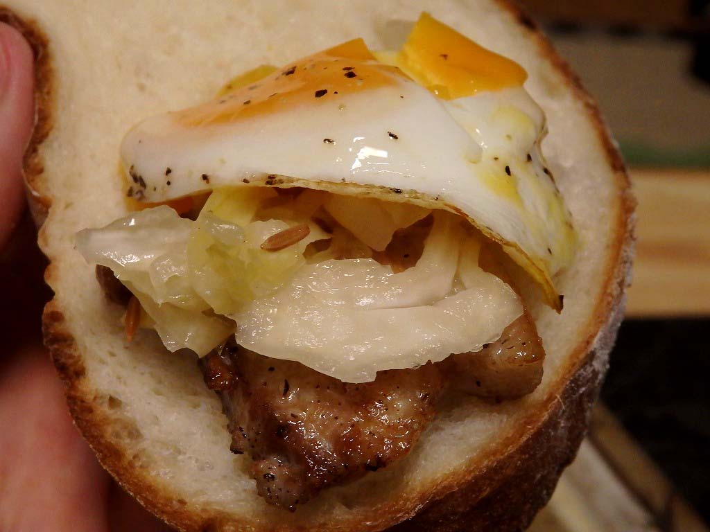 敢えてトーストせずモチモチ感全開の全粒粉パンと、カリカリに焼いた豚バラ、ソーセージ
