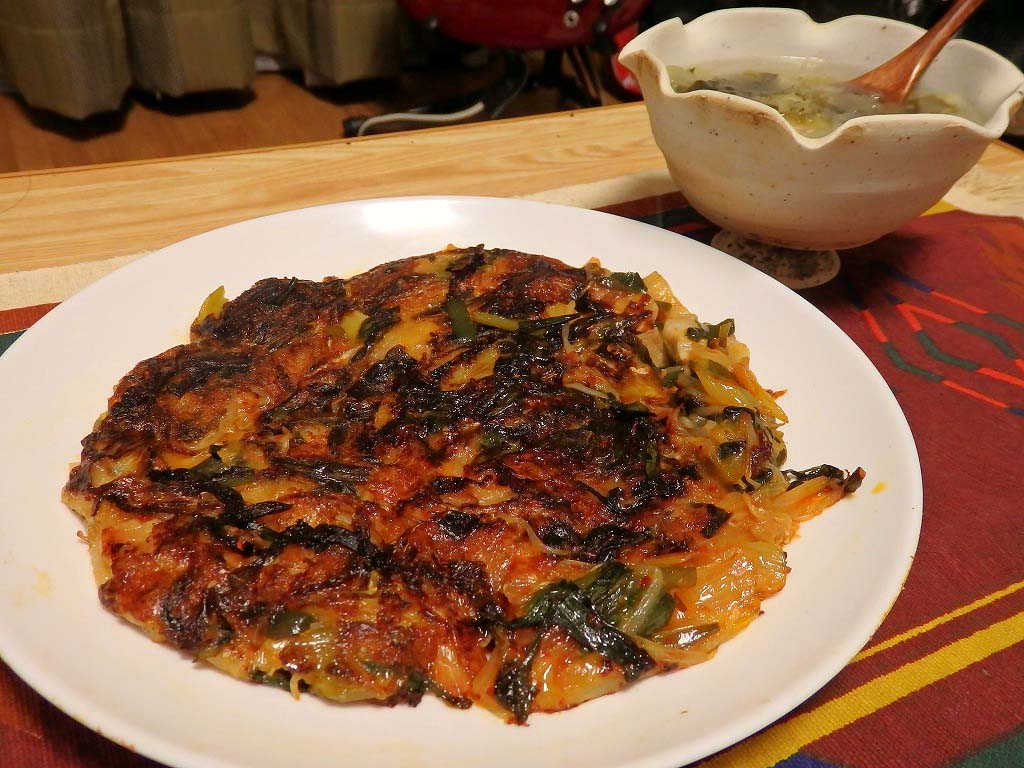 <ニラねぎたっぷりキムチチヂミ、スーパーすっぱいスープ>