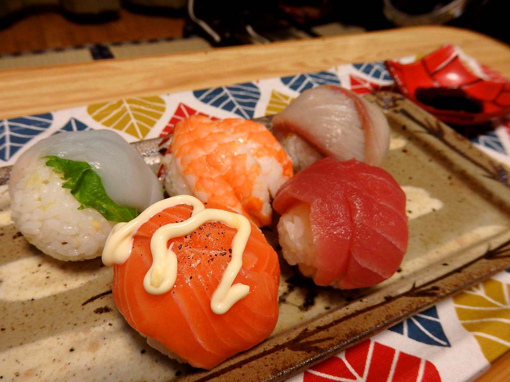 ということで、刻んだザワクラをご飯に混ぜた酢飯モドキにネタを乗せ、