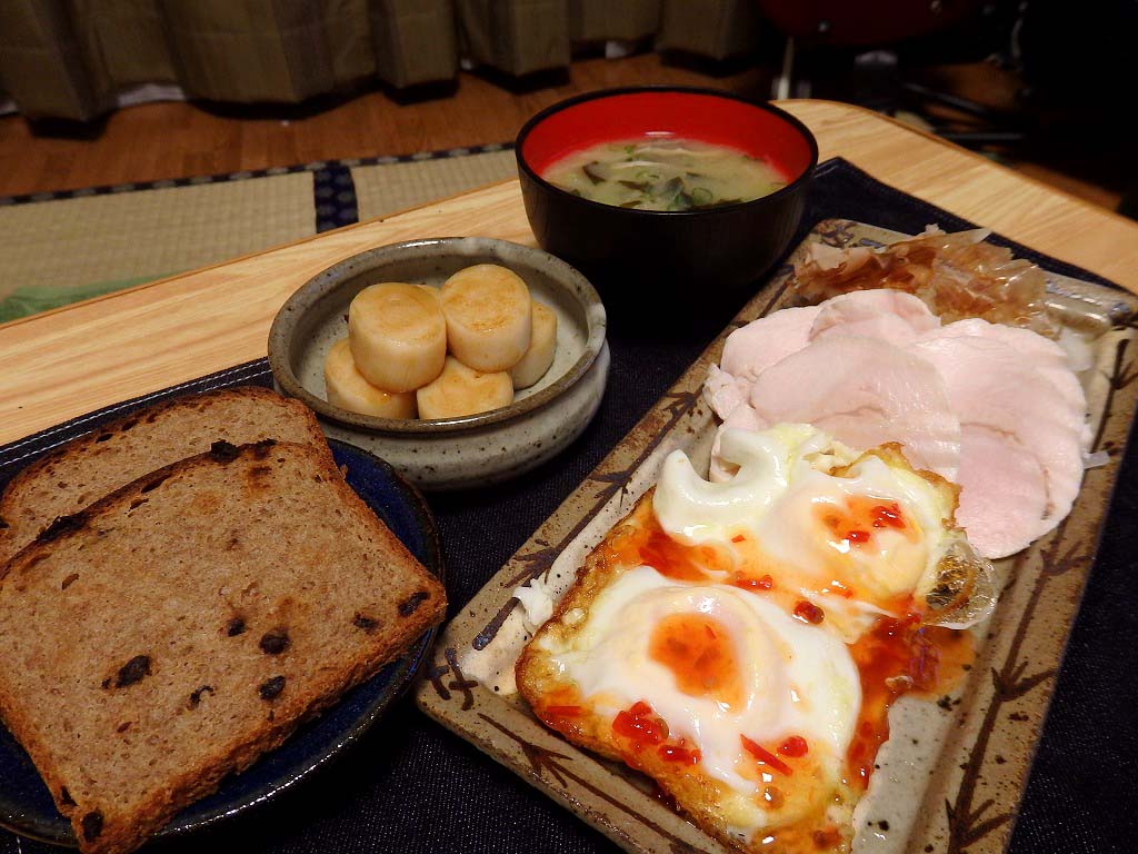<ハム&エッグとドイツパンのセット、ほぼホタテのバター醤油焼き>