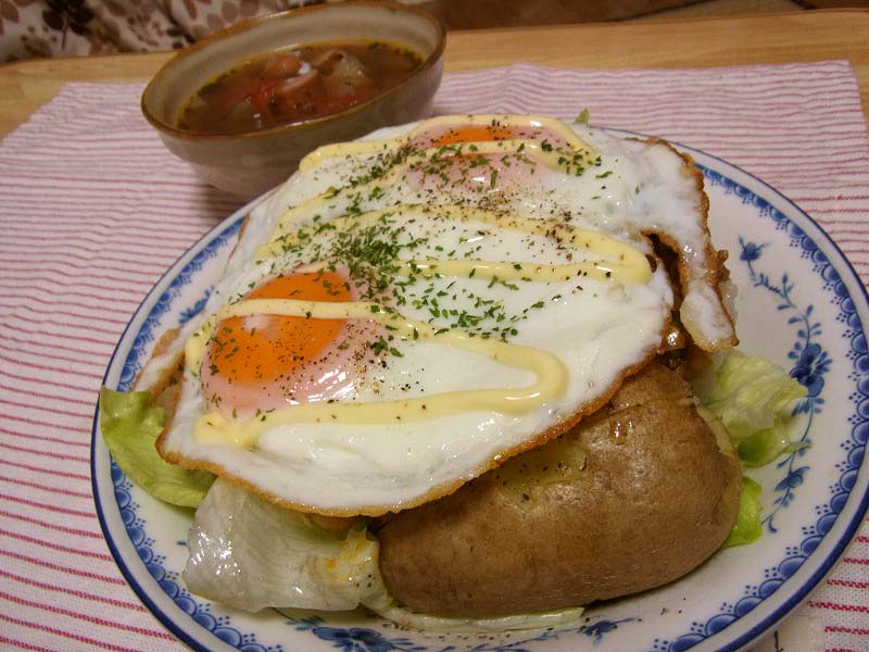 <タコライス目玉焼きのっけぇの、じゃがバタ添えぇの>