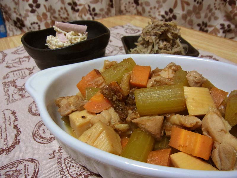 <根菜と鶏肉の炊いたん、切り干し大根のサラダ、さば缶ともやしの生ふりかけ風>