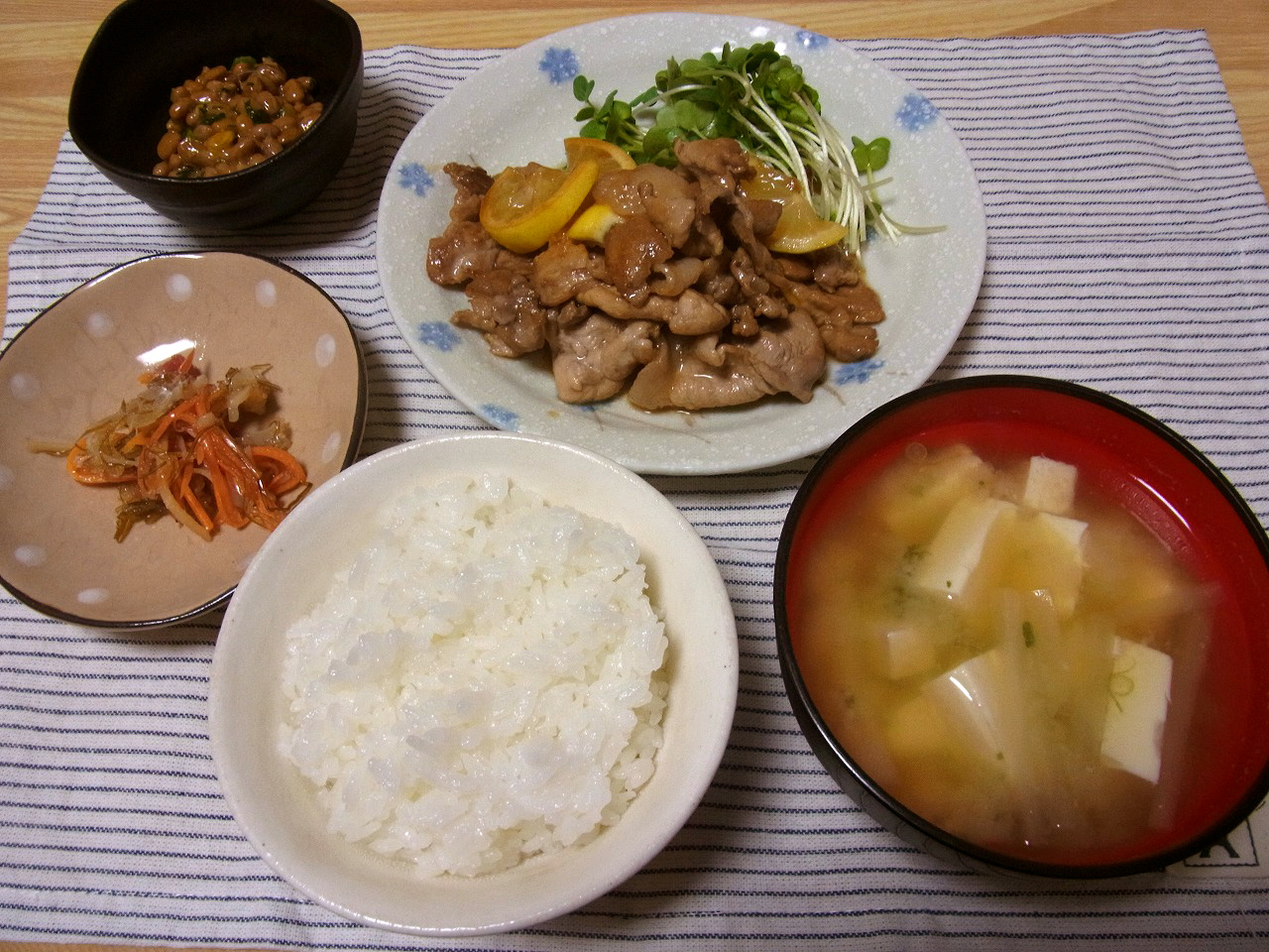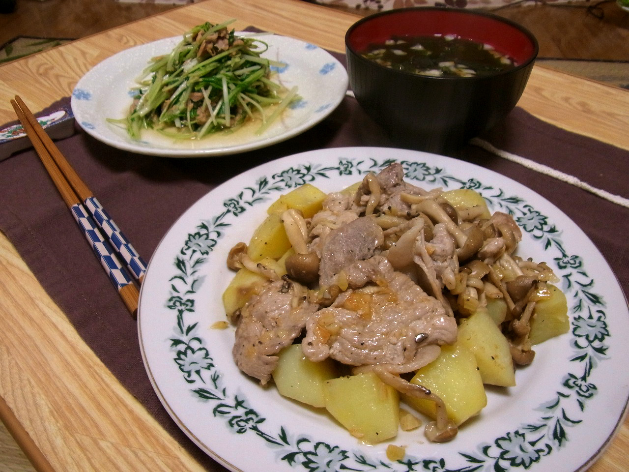 <豚肉のピリ辛ガーリックバター炒め、水菜とツナの炒め、わかめと柚子のお吸い物>