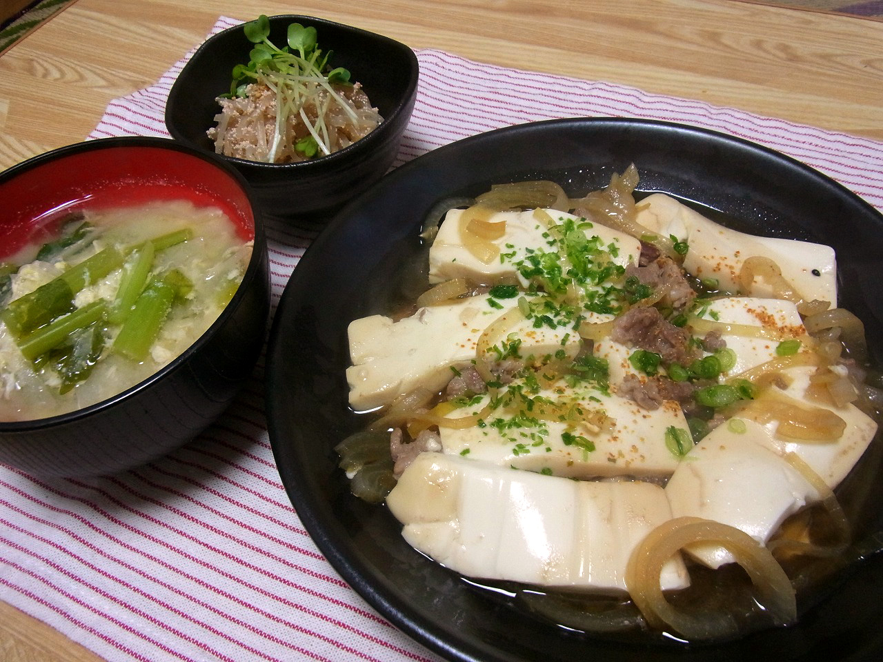 <肉豆腐、たらこと糸こんの炒め、カブの葉と皮のかきたま汁>