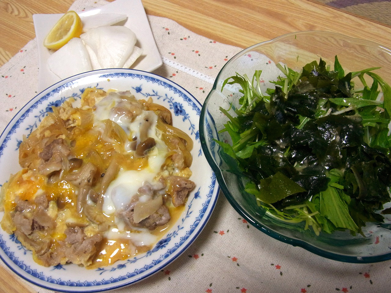 <他人丼、水菜とわかめの塩だれサラダ、大カブとレモンの甘酢漬け>