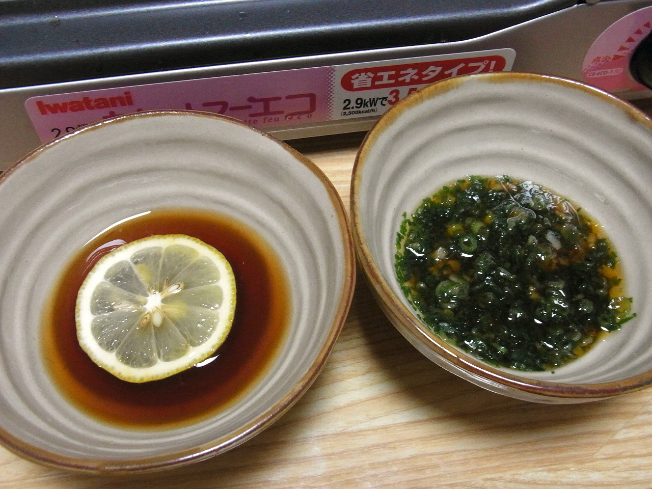 タレは2種類、左はまいね家でよくやるそうめんつゆのアレンジ版で、