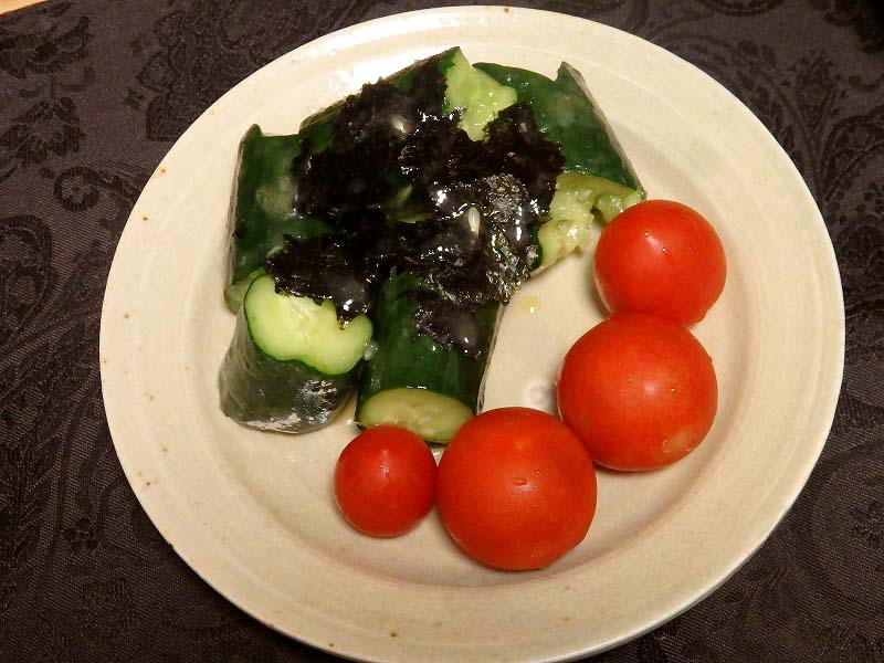 中皿に乗っているのは自家製塩だれのたたききゅうりと冷やしミニトマト。