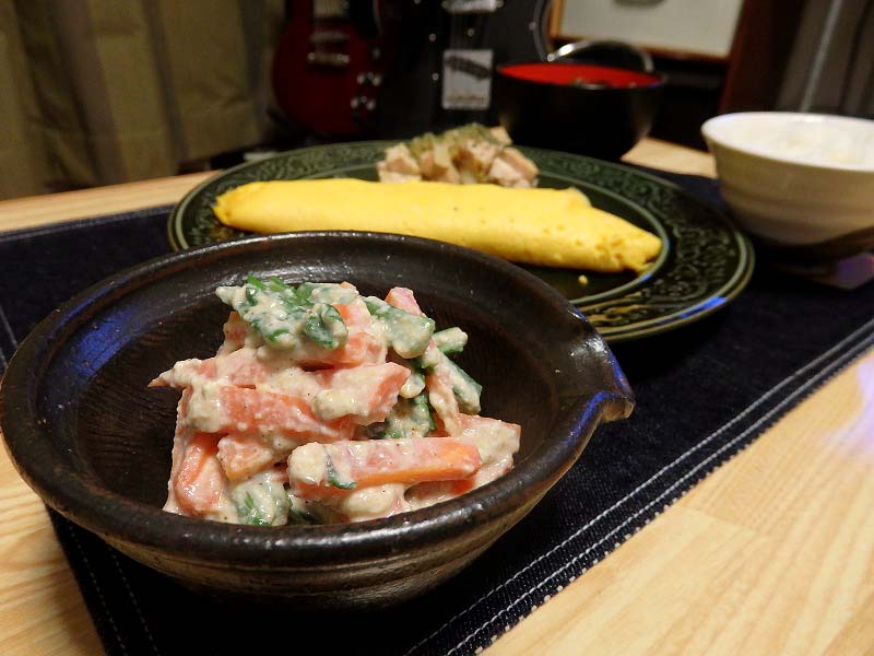 <人参と菊菜の白和え、プレーンオムレツ、鶏胸とザワクラの電気炒め>
