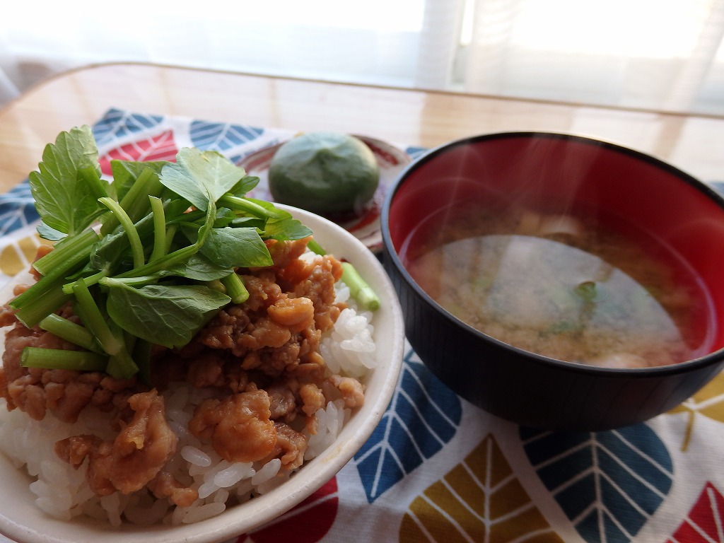 ご飯が炊きあがったら茶碗に盛り付け、そぼろを乗せ、