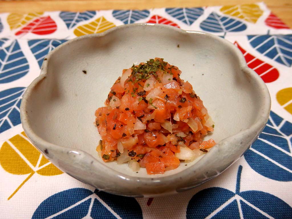 刻んだスモークサーモンに刻み玉ねぎを合わせ、オリーブオイル、バジルなどと和えた