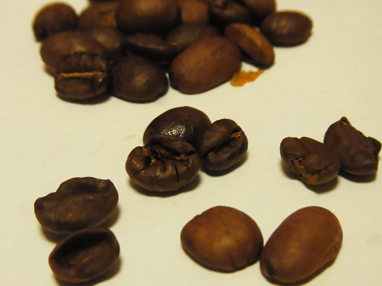 手前右側(煎りが浅い)と、中段真ん中(煎りすぎ)は煎りムラのあった豆。