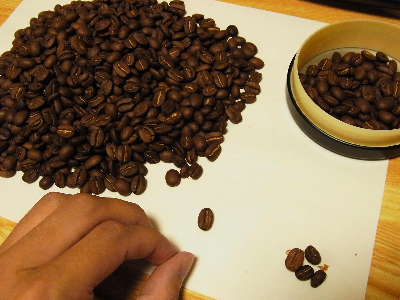 <およそ300gの豆をコツコツ選り分けます・・・>
