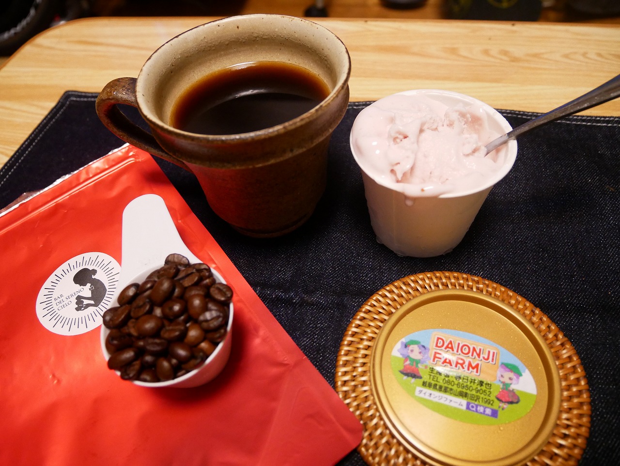 <DAIONJI FARMいちごジェラート、BAR DEL SERENO CIELOコーヒー豆>