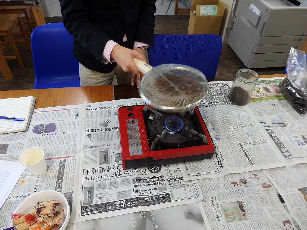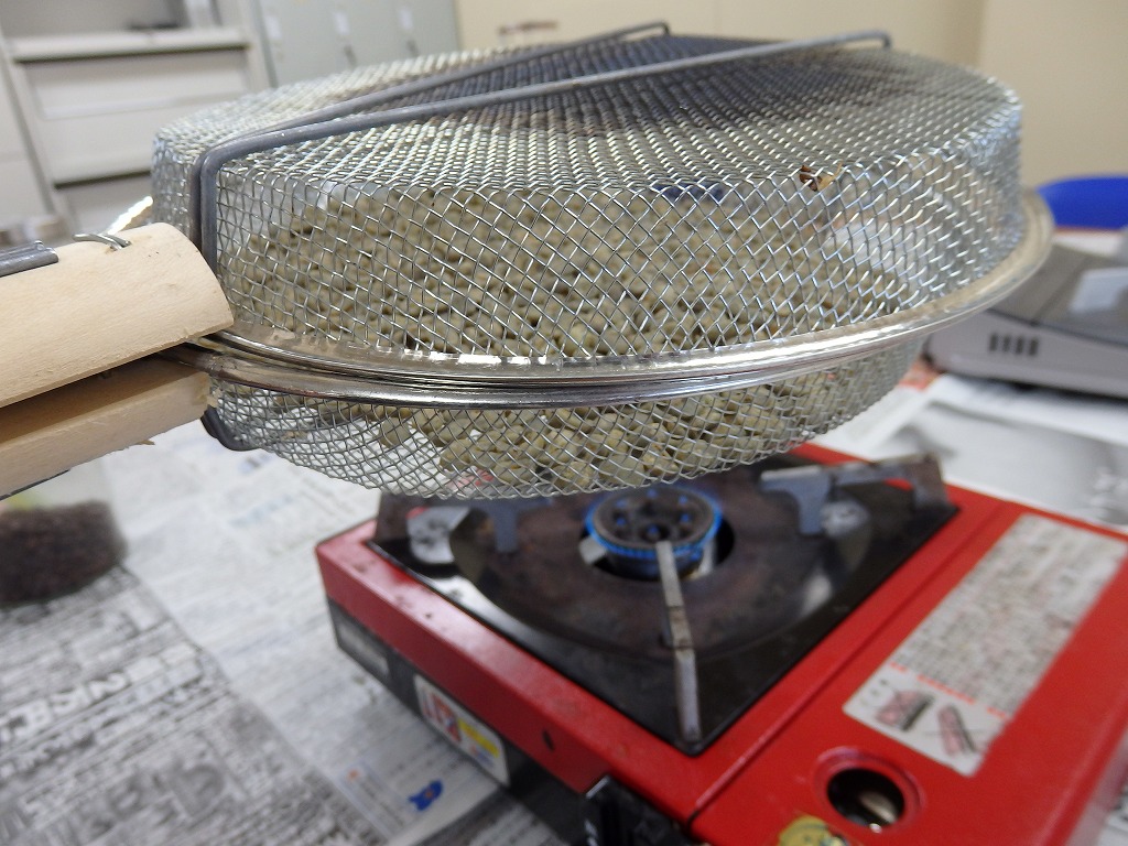 座学の後は、コーヒーの生豆をガスコンロで手焙煎してみる実践編です。