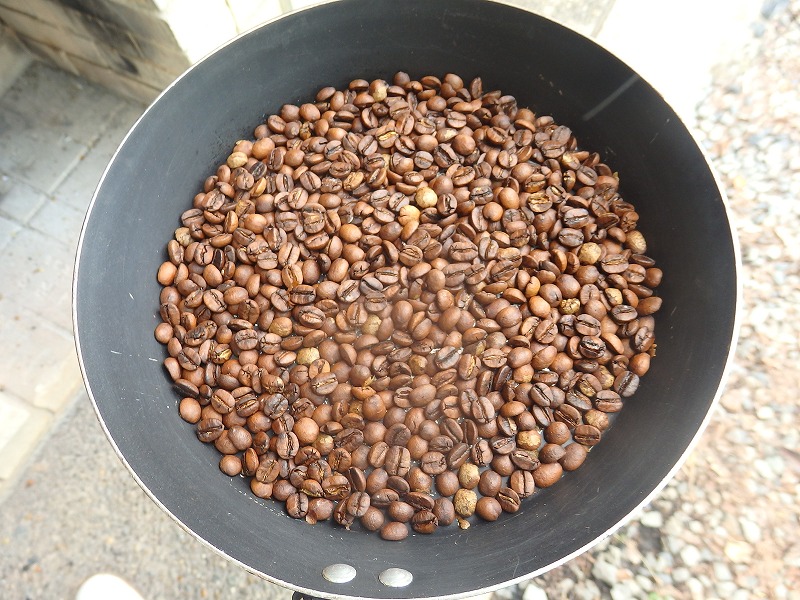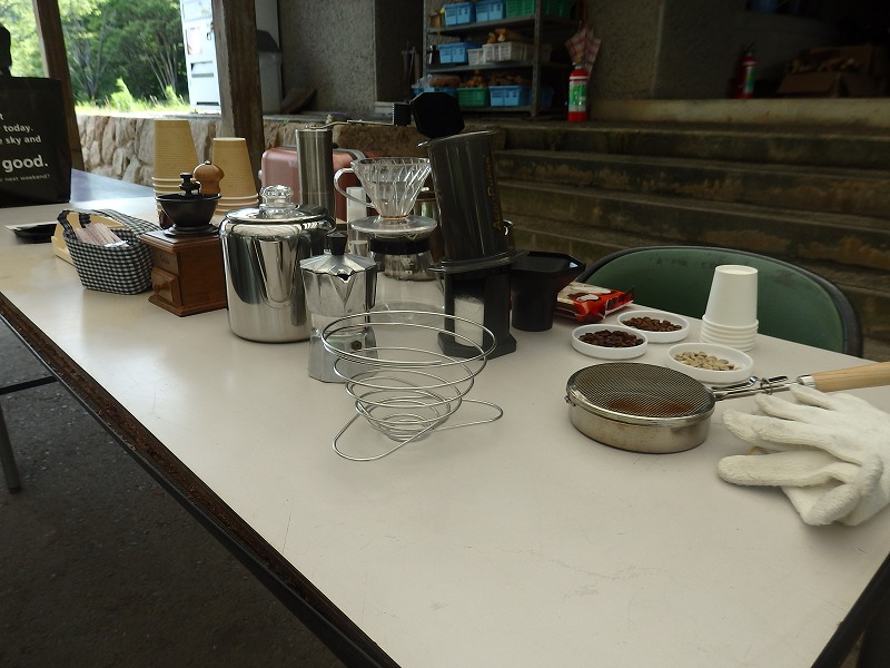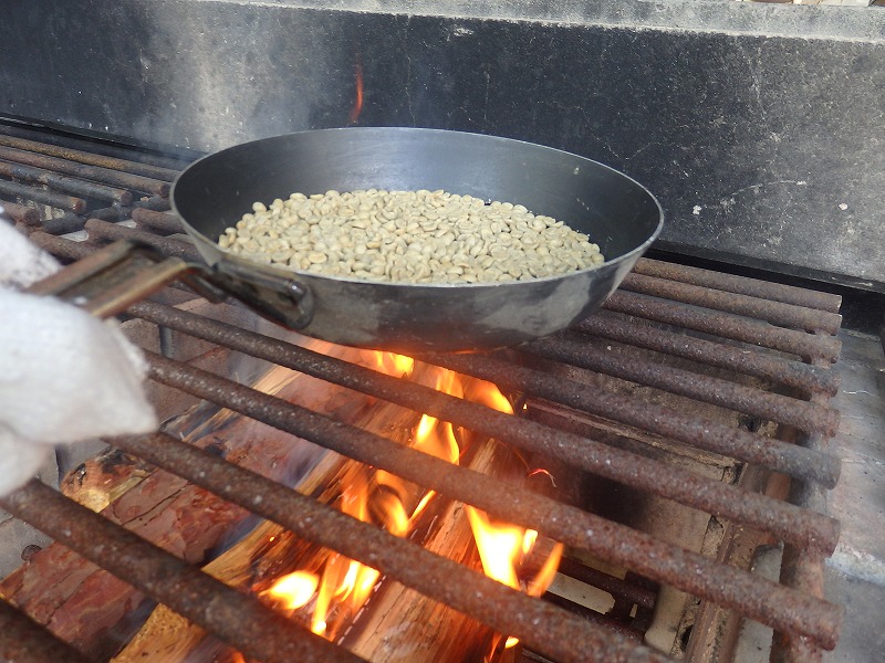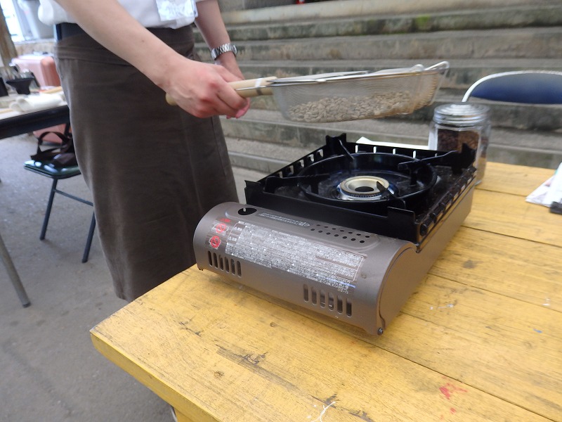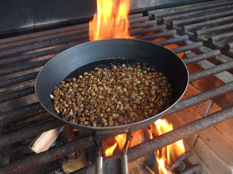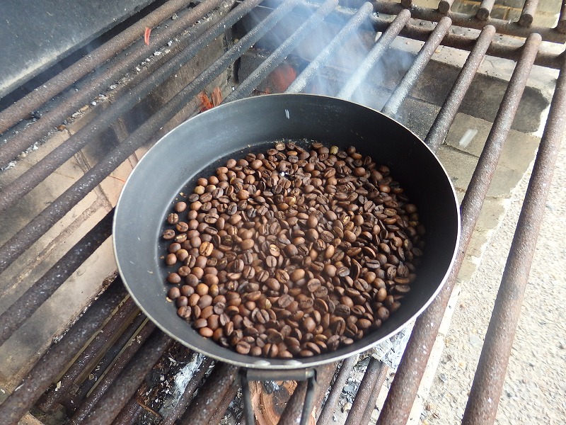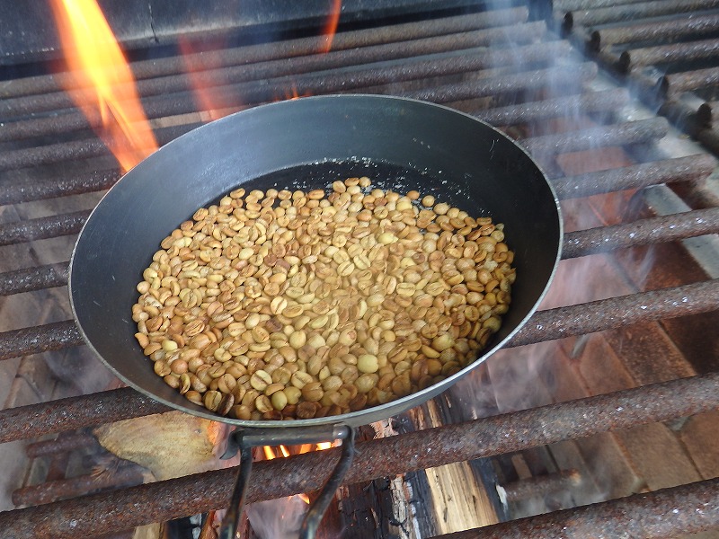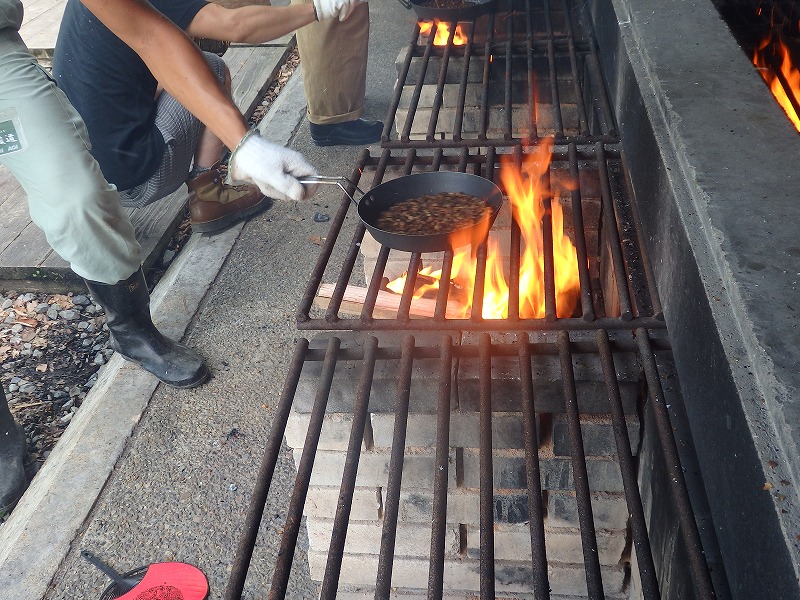 ”たけべの森のキャンプ場に併設されたバーベキュー炉を使い、コーヒー豆の焙煎を行う”