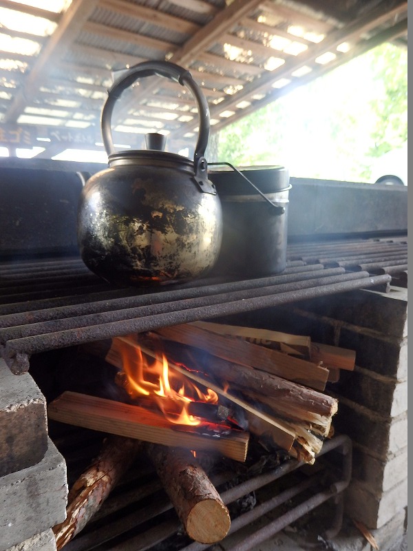 今回はバーベ―キュー炉での薪の火、フライパンを使うのでニュアンスは違いますが、