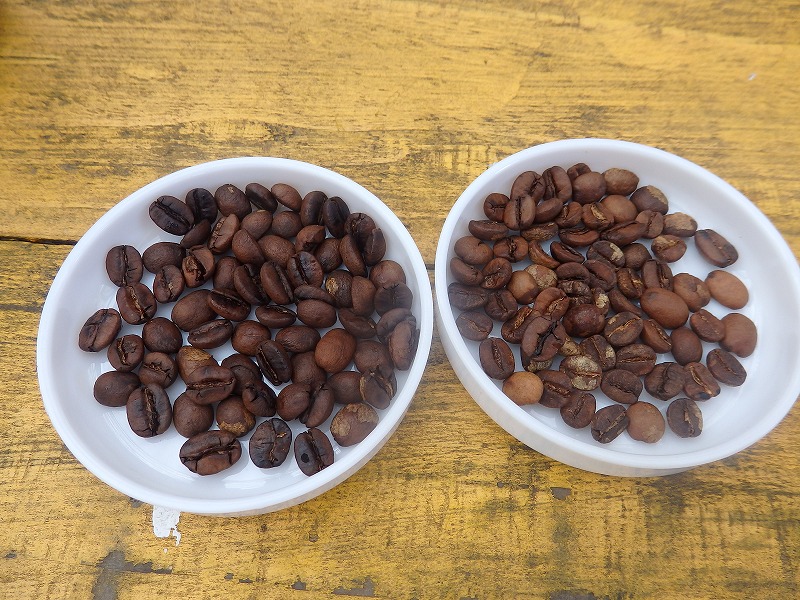 <サンプル豆。左:フライパン焙煎、右:手網焙煎>