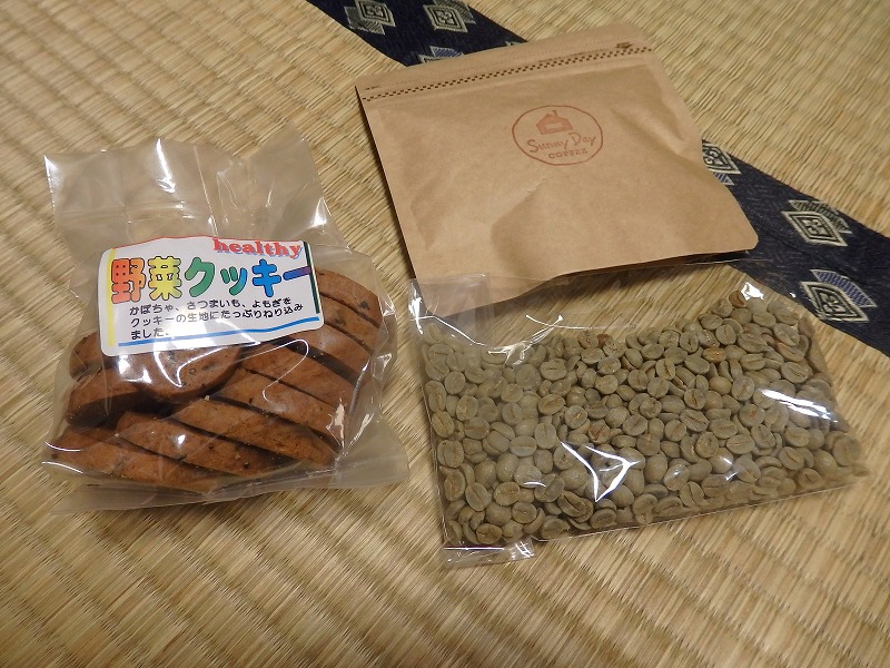 自分の煎った豆、家で煎る用の生豆、野菜クッキーをいただいて帰宅。