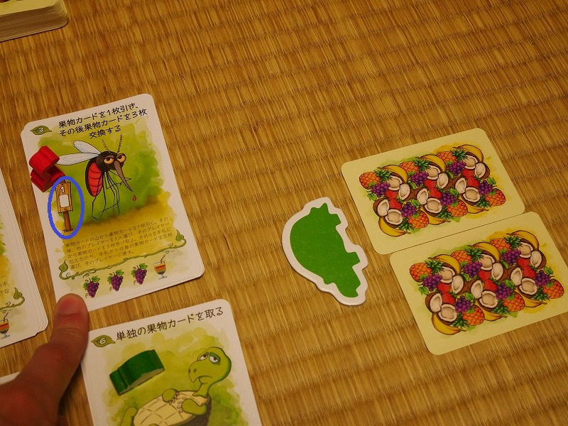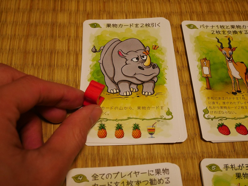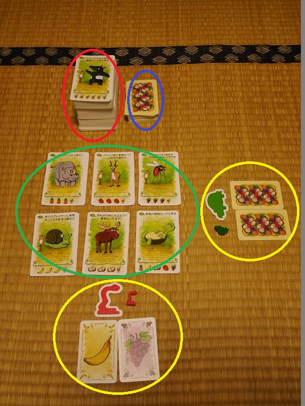 好きな動物トークンと動物コマ、果物カードを2枚持った状態でスタートです。