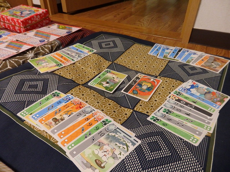 【万猫の豊明かり】概要:猫たちの大宴会。酔っ払いすぎないようにお酒飲みつつ、魚をたくさん集めるニャ!プレイ人数:3-4人プレイ時間:20-40分宜しければこちらもどうぞ