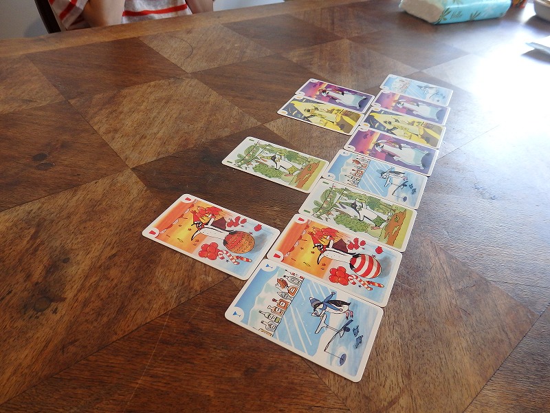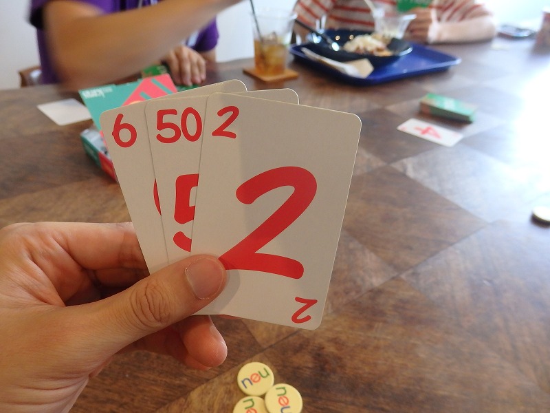 各プレイヤーが3枚の手札から場にカードを重ねていって、