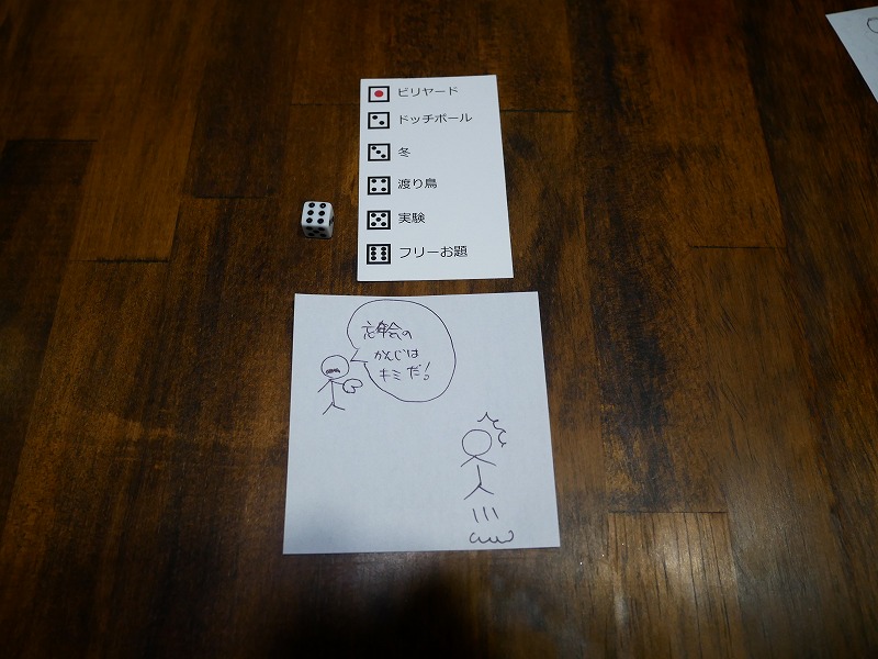 ダイスとカードで漫画タイトルを決め、1コマ目から順番に漫画を描いて、