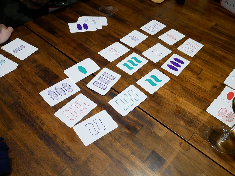 中途半端に2対1になっている要素がない3枚一組を見つけたら「セット」とコールして、カードを取ります。